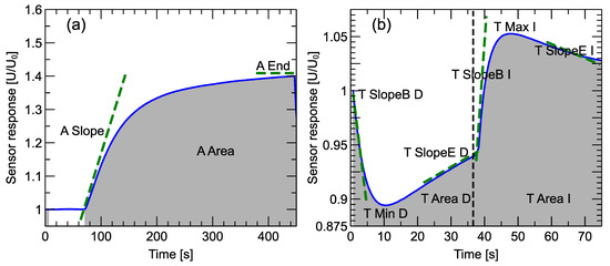 The presented curve is the voltage measured at the resistor serially connected to the sensor [34] and represents the sensor’s conductivity. This quantity can be presented in arbitrary units, as the important quantity is the relative value , where is the baseline level. What is important is that the baseline level has different meanings for two methods of creating the transient response. For the data collected during the adsorption phase, the baseline level is the voltage determined when the sensor was exposed to clean air. For the temperature modulation phase, the baseline level is the voltage measured just before the start of the modulation cycle.