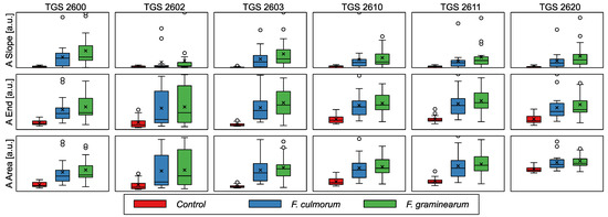 One comment is worth mentioning: The prepared samples of infected grain were similar when we could visually examine their coverage by fungi, as they all were infected at the same moment. However, the difference in mycelium amount could be noticed, and we could also observe that, during the experiment, they still grew, which introduced additional differences between them. For that reason, we could also expect that there will be various amounts of volatiles produced in each of the samples and each of the days of measurement. Such variability in the preparation of samples for an electronic nose measurement is desired, as the focus of the performed analysis is to find patterns of “odor fingerprints” and differentiate between healthy and infected samples regardless of odor strength. In further experiments, even more varied samples should be used, especially the samples with small amounts of fungi, which could be interesting for attempts to determine the level of infection or the threshold of detection.