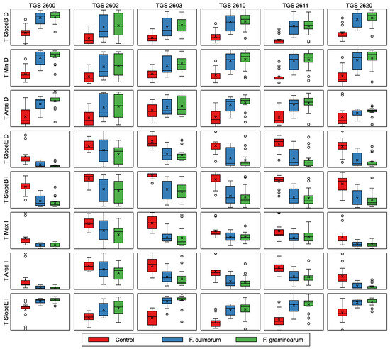 Fusarium fungi pose a direct threat to human health, for example, by infecting the eyes or fingernails. Fungi belonging to this genus are important in agriculture as pathogens of economically important crops. Two Fusarium species, F. graminearum and F. oxysporum, are included [1] in the list of the 10 most important pathogens of plant diseases. The species F. graminearum and F. culmorum are considered to be the main causes of Fusarium head blight (FHB), a disease that affects the ears of cereals such as wheat, barley, and other small-grain cereals [2,3,4]. Among other problems, this disease causes yield reductions and a deterioration in yield quality by contaminating the grain with mycotoxins, which are secondary metabolites of Fusarium [5].