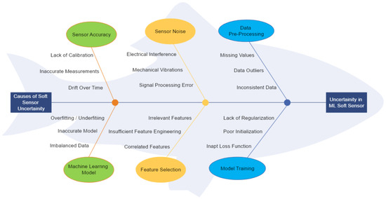 A cause-and-effect diagram, as shown in Figure 1, is a general tool for linking effects to causes. It is often applied to uncertainty budgets for measurement devices to identify the most important contributors to the uncertainty in the data captured by a sensor [14]. Generally, the diagram is filled out by experts from the domain or derived through literature research. It helps to identify and visualize the root causes of issues or challenges in evaluating uncertainty by using an ML model as a soft sensor.