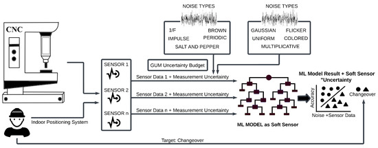 This article is structured as follows: Section 2 introduces the ML model as a soft sensor and explains the measurement uncertainty. An overview of the research can be found in Section 3. The experimental setup for detecting changeovers in CNC machines is mentioned in Section 4.1. It is followed by a description of the key noise types used in the study and their characteristics in Section 4.3. The LightGBM soft sensor framework used in a Monte Carlo setting is explained in Section 4.4. Section 5 describes the results derived from the LightGBM model and presents a further analysis in terms of outlier dispersion, kernel density estimations, and swarm analysis. It also describes the variations in accuracy and (FPR) with respect to the changing intensity of different noise types. The practical and strategic findings from the study regarding the classification of the noise types and understanding of the noise intensity threshold are mentioned in Section 6.