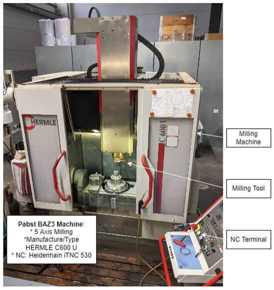 All of the NC data were acquired from a milling machine, HERMLE C600 U, at the company Pabst Komponentenfertigung GmbH from the OBerA project consortium. The specific machine used in this study is shown in Figure 3. The CNC machine had 5-axis kinematics and an NC HEIDENHAIN iTNC 530, which was compatible with the HEIDENHAIN DNC interface. An Ethernet switch was utilized to link the NC and the NUC mini PC. An SQL database received the data after they had been processed by the Node-RED programming interface. The HEIDENHAIN DNC enabled communication between an agent on the PC and the NC. The MQTT protocol was used to transmit the data from the agent onto a Cybus Connectware interface. The Cybus interface exported these internal variables, such as door switches, through the HEIDENHAIN DNC interface, making these characteristics accessible.