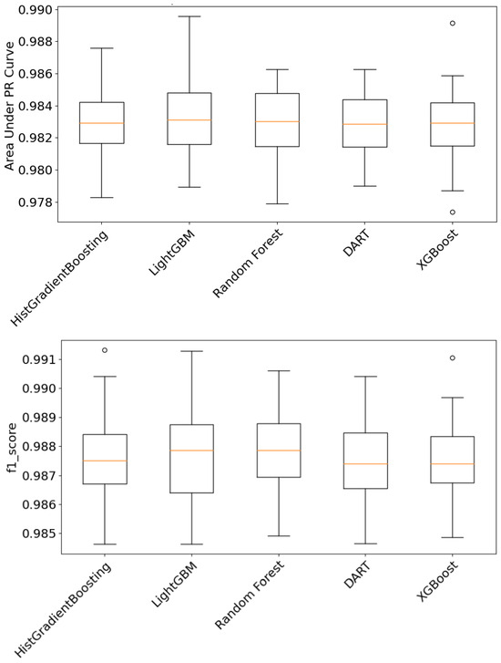 The boosting family of algorithms is less susceptible to outliers, can handle a variety of categorical and numerical variables without considerable preprocessing, and is scalable with efficient and parallelized implementations for diverse classification problems [58]. The HISTGradientBoosting [59], LightGBM, Random Forest [60], DART [61], and XGBoost [62] algorithms were compared to find the best ML soft sensor that was most appropriate for this case study. A box plot, which is shown in Figure 4, was used to reflect the probable outliers, central tendency, and dispersion for the HISTGradientBoosting, LightGBM, Random Forest, DART, and XGBoost algorithms in predicting changeovers in the presence of Gaussian noise. The (AUC-PR) metric indicated that LightGBM outperformed all other classification techniques, as shown in Figure 4 (Top). The median and upper quartile for the F1 score were better for LightGBM when compared to Random Forest and other algorithms in the boosting family, as shown in Figure 4 (Bottom).The evaluation had outlier values visible as a circle for XGBoost for AUC-PR curve metric and F1 score. The HistGradientBoosting also had a similar outlier value for the F1 Score.
