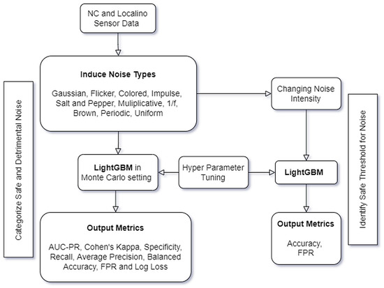 LightGBM is known for its efficacy and superior performance due to its gradient-boosting architecture and traditional tree-based approaches to learning. It is crafted to handle large datasets and feature spaces with high dimensions while consuming the least memory and training time possible [63]. The ensemble of decision trees in LightGBM learns from the errors of the previous iteration in the training process. LightGBM extends the tree leaf-wise and prioritizes the nodes that give the most potential information gain by choosing the leaf node that reduces the loss at each split. This method often produces a more condensed tree, capturing more intricate data patterns. LightGBM uses histogram-based learning, which improves training efficiency and memory consumption. It creates histograms for discrete attributes in the dataset rather than sorting and binning the data points. The gradient-based histogram approach identifies optimal split points by computing the gradients of the loss function for every observation [64]. LightGBM uses a feature bundling strategy that groups relevant features to handle the dimensionality of data. Categorical features can be handled by LightGBM using a technique known as gradient-based one-side sampling [65]. The data from sensors for analyzing changeovers have categorical attributes, namely, ProgramStatus, ToolNumber, and PocketTable, as shown in Table 1. The flow of the work of understanding the effects of noise types on the performance of LightGBM is depicted in Figure 5.