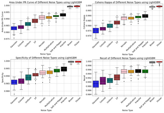 The change in the level of accuracy of LightGBM based on the intensity of noise was verified using several output metrics—AUC-PR, Cohen’s Kappa, specificity, and recall—that were affected by various noise types—namely, Gaussian, Brown, Uniform, Salt-and-Pepper, Impulse, Flicker, Multiplicative, Periodic, 1/f, and Colored noise—as shown in Figure 6. It is evident from the results that the LightGBM model performed very well in the presence of Flicker and Brown noise, indicating that these two noise models had the least effect on the performance in predicting the changeover process.