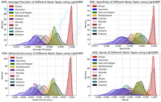 (KDE) plots were used to visualize the distribution of the average precision, balanced accuracy, specificity, and recall metrics, as shown in Figure 7. In particular, evaluating the kurtosis and skewness of the distributions across multiple noise scenarios can be useful for model adaptations.