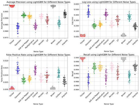 Swarm distribution plots, which are shown in Figure 8, offer a useful depiction of the LightGBM model’s performance, making it simple to compare the metric distributions across noise types. The average precision, FPR, log loss, and recall showed a compact swarm distribution pattern for Flicker and Brown noise. In contrast, Gaussian, Colored, and 1/f noise exhibited a more extended spread of swarm clusters, particularly in the recall values. Notably, Salt-and-Pepper, Multiplicative, and Periodic noise displayed relatively similar swarm clusters of metric values. The Flicker and Brown noise were found to have the lowest FPR in the range of 0 to 0.003. The Gaussian noise had the highest FPR, with values in the range of 0.011 to 0.024. It measured the rate at which the LightGBM model misclassified the negative changeover class as positive. This was crucial because the number of erroneous alerts in changeovers must be kept to a minimum to enhance productivity. The log loss score also showed a similar pattern to that of the FPR, as indicated in the swarm plot. A lower value for the log loss indicated a higher confidence level in the LightGBM model’s predictions.