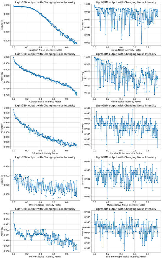 LightGBM with Gaussian-induced noise significantly dropped its accuracy levels after the noise intensity increased beyond 20%. The changing intensities for Gaussian noise had a “water-pipe-flow” effect and depicted a “concave-down-decreasing” influence on the accuracy values. The intensity factor of 20% can be regarded as the threshold limit for Gaussian noise. The accuracy remained at a high level of about 98% until this threshold limit, after which the accuracy decreased linearly as the intensity factor increased.