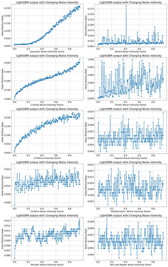 The subsequent experiment controlled the intensity of each noise type on a scale from 0 to 95%. It was interesting to determine the threshold limit if it existed for each noise type, which would be where the accuracy of predictions using LightGBM did not downgrade to a large extent. The noise types were added with varying intensities, the accuracy of LightGBM was assessed, and the results are shown in Figure 9. Accuracy and FPR were used as metrics to evaluate the sensitivity of LightGBM to changing noise intensities, since they were straightforward to comprehend and use. Accuracy measured the proportion of precise estimations in the overall predictions, and FPR highlighted Type I error and focused on the frequency of inaccurate classifications of the changeover class. The so-called “easing functions” (https://easings.net/ accessed on 4 January 2024)), as well as self-speaking catchwords from colloquial language, were used to describe the following curve plots.