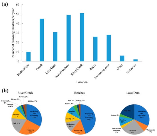 (a) Number of yearly drowning deaths by location. (b) Activities before drowning incidents by location (river/creek; beaches; lake/dam) in 2019/2022 [16].