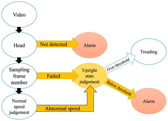 Feature extraction, feature expression, and evaluation criteria are available for estimating typical swimming speed based on swimmers’ motion capture—determining orientation independent of the camera angle and assessing a risky situation, as depicted by the chart in Figure 2 [54]. An alarm is triggered if no head is located within a given time range. If no bounding box overlaps the initial bounding box of the head, then the target is not swimming. In that case, whether the swimmer is treading water upright is assessed. An alert will sound if the swimmer is in a risky upright posture. The typical swimming speed may be calculated if the number of sample frames and intervals is known. This approach helps identify any changes in the swimmer’s speed and determine if these changes are unusual. When the threshold is exceeded, an assessment of a dangerous upright condition is performed. Again, a warning will sound if the swimmer is upright and in a dangerous posture. Using the bounding box of the swimmer’s head and the overlapping area of the neighbouring bounding box eliminates the error created by directly applying the object displacement time ratio. When the camera’s optical axis is not perpendicular to the swimmer’s direction, the long and short axes of the outer ellipse of the human body do not operate. However, in such scenarios, measuring the ratio of the head size to the body size provides a more accurate way to determine if the swimmer is in an upright position.