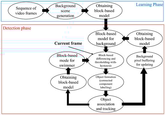 As shown in Figure 3, the approach for swimmer status extraction comprises a learning phase that constructs the initial background model and a detection phase that separates swimmers from the non-stationary pool background [42]. Addressing the issues experienced by automated surveillance systems under challenging contexts is necessary for developing algorithms for a system capable of detecting water emergencies in highly dynamic aquatic environments. A robust segmentation algorithm based on block-based background modelling and thresholding with a hysteresis approach enables reliable detection of swimmers in reflections, ripples, splashes, and fast illumination changes. A Markov random field architecture addresses partial occlusions, enhancing the system’s tracking capabilities. The relatively high noise level in the foreground detection and behaviour recognition steps represent a significant obstacle to solving the problem [55]. As a result, background subtraction, denoising, data fusion, and blob-splitting techniques are used, motivated by the peculiarities of the aquatic background and the crowded pool situation. In addition, visual signs of distress and drowning are integrated via a set of foreground descriptors in the detection stage for early drowning. Also, a module consisting of data fusion and hidden Markov modelling is built to discover the distinctive characteristics of various swimming behaviours, notably those early drowning incidents.