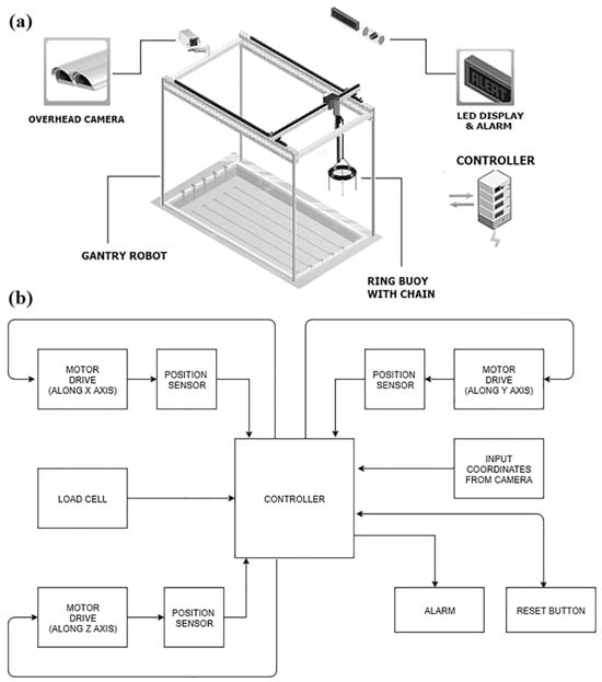 Robotic technology may assist in reducing drownings in swimming pools. For instance, Laxman and Jain [59] used submerged and buoyancy-dependent lifts, motion detectors, and laser tripwires to create fail-proof autonomous rescue procedures. In order to counteract a number of the shortcomings of submerged cameras and systems [44,45,60], a study by Jose and Udupa [61] examines several approaches for screening swimming pools using the above cameras [62]. Most drowning detection systems consist solely of the detecting component, which a skilled lifeguard can cover. Fear and adrenaline make drowning individuals quite twice as strong as normal, and they will grasp anything to survive. Therefore, only a trained lifeguard can effectively save a drowning person. Using locations from a camera above, the suggested robot design in [61] will provide the correct assistance at the right moment, eliminating the need for lifeguards. The fully automated mechanism can transport the sufferer to the pool edge. As seen in Figure 4, the suggested system comprises three components: (1) an LED display with an alert system, (2) a top-mounted camera, and (3) a gantry robot. The camera is equipped with a drowning-detecting system that examines the shape and velocity of the swimmer. When the camera detects drowning, the system sends coordinates to the gantry. The camera coordinates to tell the robot where to release the ring buoy. A nylon chain and ring buoy will help the distressed swimmer ascend the drift. A load cell at the end can determine if someone climbed on the dropped buoy by measuring its effective weight. If the system detects a load, it pulls the victim on the ring buoy back to the home position. When the camera detects drowning, it activates the LED display and alarm unit to alert rescuers.