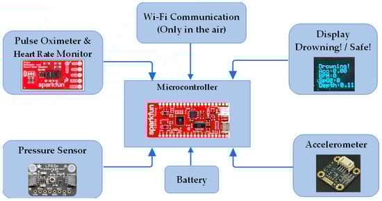 Survey results [75] indicate that if additional parameters are monitored simultaneously, the accuracy of sensor-based approaches can be improved to a level equivalent to other high-accuracy but more expensive methods, such as image-processing techniques. However, more research is still needed to improve the performance of the sensor-based systems. If one sensor in a multi-sensor device does not promptly pick up on the drowning scenario, other sensors will. One example is the waterproof device for detecting drowning presented by Jalalifar et al. [4]. The device includes heart rate, blood oxygen saturation, swimming patterns, and depth sensors. Each sensor can operate autonomously to increase the system’s anti-drowning capabilities. The microcontroller compares collected data from sensors with user-defined criteria to determine an impending threat. The warning will display if the danger persists over a specified interval. A drowning or safe message may be shown by comparing these values and keeping track of time underwater. The data collected by the sensors may be seen on an OLED screen, connected mobile device, or computer. Unfortunately, the device cannot transmit Wi-Fi signals while submerged in water. Figure 5 depicts the proposed sensor-based system, which uses a microprocessor, sensors, a communication system, and a battery.