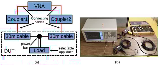 Calibration is a key step in our measurement setup. As shown in Figure 2a, the VNA is connected to the actual device under test (DUT) through PLC couplers and connection cables. The calibration de-embeds those ancillary components so as to measure the S-parameters of the DUT network. We perform calibration using a commercial calibration kit and applying the usual short, open, load and through measurements. Figure 2b shows the setup for the through measurement. Once the calibration is completed, the VNA measurements give us the S-parameters of the DUT, where the two 30 m cables are connected to a power bar with several appliances, as explained in Section 2.3 below. From these, the ABCD parameters can be obtained as per (3).