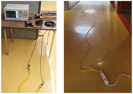 Photos of the measurement setup with the layout of the 30 m cables. Labelled items are 1—low-voltage power extension cables, 2—power bar.