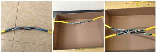 In Stage 1, 20 cm of outer insulation is removed at Spot B. In Stage 2, an additional 20 cm of outer insulation is removed at Spot A. In Stage 3, another 3 cm of insulation and 11 strands of the ground conductor are removed at Spot B. This is shown in Figure 6 (left). In Stage 4, an additional 2 cm of insulation and 9 strands of the neutral conductor are removed at Spot A. In Stage 5, an additional 2 cm of insulation and 7 strands of the live conductor are removed at Spot A, as shown in Figure 6 (middle). In Stage 6, the exposed parts of the neutral conductor are taped to the floor surface. In Stage 7, we revert to the wire-ground taping introduced in Stage 6 and instead short the exposed part of the ground conductor at Spot B with the exposed part of the neutral conductor at Spot A. This is shown in Figure 6 (right).