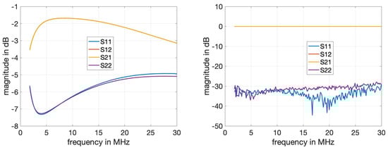 Magnitude of measured S-parameters for the series connection of the two PLC couplers before (left) and after calibration (right). The curves for the and parameters completely overlap.