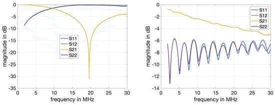 Measured S-parameters for the power bar (left) and the 30 m power cable (right) as the DUT. The curves for the and parameters completely overlap. The and parameters for the power bar (left) match very closely.