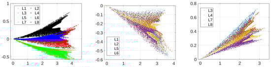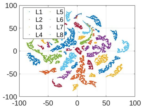 After we obtain samples for training and testing, we apply clustering as a data-preprocessing procedure. Clustering operates on dimension-reduced data. Figure 9 shows the results (we note that the quantities are projections of unitless CFR magnitudes and thus also unitless) when the 410-dimensional CFR training data are reduced to two dimensions using t-SNE, where labels L1-L8 correspond to the eight different load conditions as specified in Table 1. While we observe a separation of two-dimensional data points, a meaningful clustering structure is not immediately clear. Figure 10 shows the results for ICA. A structure that seems to lend itself better to clustering is obtained. In particular, two clusters are identified by DBSCAN for the energized case as shown in Figure 11. On the other hand, it remains difficult to pick out meaningful data clusters for the non-energized case. Hence, we treat the training samples for the non-energized scenario as a single data cluster. Very similar results were obtained when using PCA for dimension reduction prior to the clustering. For the following result, we use ICA and reduction to two dimensions, and kNN with is used to determine the cluster during testing.