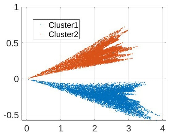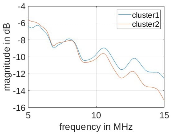 The comparison between the results shown in Table 2a,b suggests that the identification of meaningful data clusters is significant for the performance of the proposed PCA-based anomaly detection solution. As shown in Figure 11, the data for the energized scenario form two clusters vary because of the various load conditions. In particular, the data collected with the electric fan unplugged corresponding to load conditions L1, L2, L5, and L6 in Figure 10 (middle) are aggregated as Cluster 1, while the data collected with the operating fan corresponding to load conditions L3, L4, L7, and L8 in Figure 10 (right) are aggregated as Cluster 2. This is in agreement with our measurement experience, where in the energized scenario, the electric fan has the largest impact on the S-parameter measurement result when compared with the other considered loads. Figure 12 illustrates this in terms of the average CFR magnitude across samples from the two clusters as shown in Figure 12. The application of the ICA makes this difference more evident so that clustering becomes effective. This has important implications for the practical scenario, where the load impedances of the grid are constantly changing (We note that different load impedances could also have an influence through affecting line parameters due to resulting current and temperature fluctuations). In such occasions, the clustering algorithm is able to explore the internal structure of the collected data and identify several typical load conditions corresponding to different data clusters.