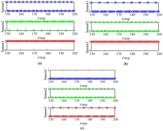 Figure 2 shows the transmission of the local filters from the three sensors for different thresholds , and parameter m is the main cause of the change in threshold . When the circle falls on 1, the FC receives the data transmitted via LF; when the circle falls on 0, the FC cannot receive the LF data. It can be seen that the larger the threshold is, the smaller the data transmission is.
