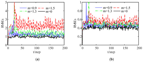 Figure 4 shows a comparison of the RMSE curves of the DFE under different thresholds after 100 Monte Carlo runs. When , all local filters are transmitted to the fusion center, exhibiting optimal estimation accuracy. Moreover, it can be seen that the RMSE curve when is at the top, that is, the system performance deteriorates as the threshold increases. This indicates that the transmission of local estimates and the estimation accuracy of the proposed estimation algorithm are both reduced when the threshold is increased. As can be seen from Figure 3 and Figure 4, an appropriate threshold cannot only reduce data communication and energy consumption but also ensure the required estimation accuracy through the proposed estimation algorithm. Moreover, the FMs and Markov jump parameters can also be handled.