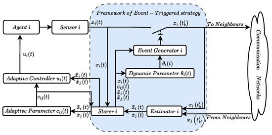 In this section, an adaptive event-triggered consensus protocol is proposed. A schema of the controller is shown in Figure 1. In general, an event-based consensus protocol mainly consists of an event-based control law and a triggering function of the agent []. The controller design input and the triggering function are given in the sequel.