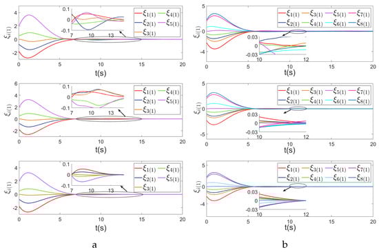 First components of consensus errors. (a) First components of consensus errors of five agents , , using the control strategies in [,] and this paper respectively. (b) First components of consensus errors of eight agents , , using the control strategies in [,] and this paper respectively.