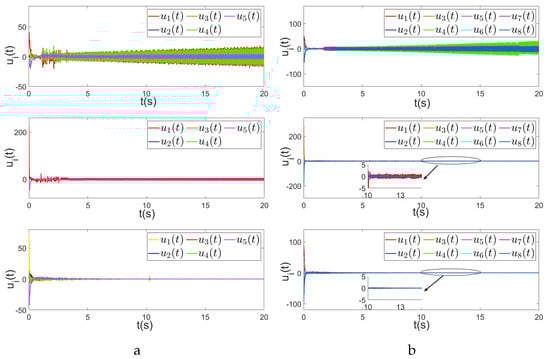 Control outputs. (a) Control outputs of the five agents, using the strategies in [,] and this paper. (b) Control outputs of the eight agents, using the strategies in [,] and this paper.