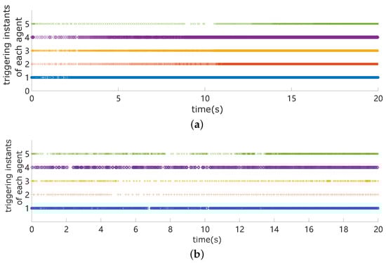 Triggering instants of agent i, . (a) The triggering instants of agent i under the control strategy proposed in []; (b) The triggering instants of agent i under the control strategy proposed in this paper.