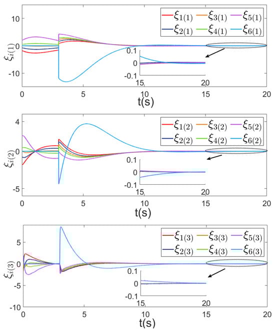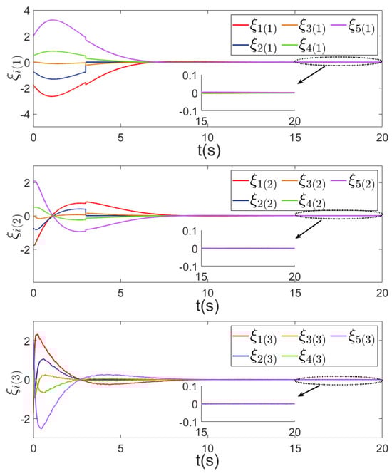 Using the controllers proposed in this paper and in [,], the comparison of the first components , of consensus error is given in Figure 4, in which we observe that by using the proposed control, the MAS achieves consensus asymptotically and the convergence speed is faster than that in [,].