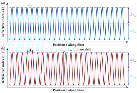 (a) Refractive index modulation in a uniform FBG and (b) refractive index modulation with inserted π phase shift [22].