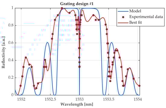 The modeled reflectivity spectra of a first π-PSFBG design (blue line) compared to experimentally obtained values (red dots) and their best fit (red line), respectively.