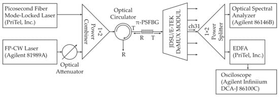 In our experimental investigation, we opted for the experimental setup depicted in Figure 4. At the input, we used a sech2 optical laser pulse (2 ps FWHM and 1.4 nm spectral width) generated by a tunable erbium-doped fiber actively mode-locked laser (PriTel, Inc., Naperville, IL, USA). The laser output was spectrally tuned to overlap with the designed central wavelength transmission region of the investigated π-PSFBG. The laser pulse, after passing the π-PSFBG, is delayed due to its interaction with the grating. The largest time delay is for the designed grating central wavelength λcd = 1552.42 nm.