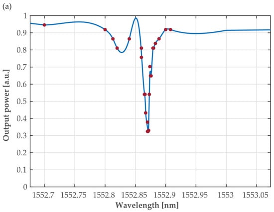 The π-PSFBG spectral reflectivity measured at the OC port-R is shown in Figure 5a, where red dots are experimental data and the blue line is their best fit.
