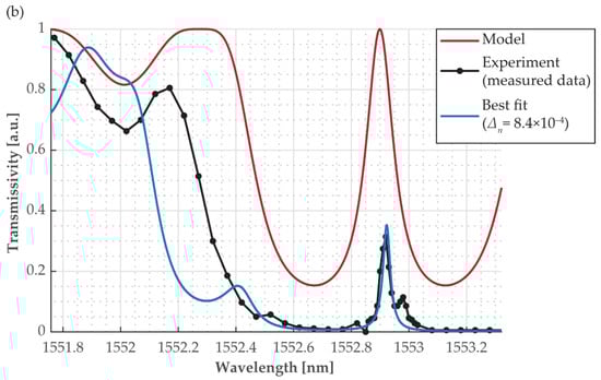 (a) Measured spectral reflectivity of the 2.8 mm π-PSFBG. The red dots represent experimental data, and the blue line is the best fit; (b) spectral characteristics of the 2.8 mm π-PSFBG. Modeled (red line), measured data (black), and the blue line is data best fit, respectively. Notice a small difference between the value of the designed central wavelength λcd = 1552.9 nm and its measured value λcm = 1552.92 nm. The measured lower transmissivity is a result of the omission of a loss coefficient in the model.