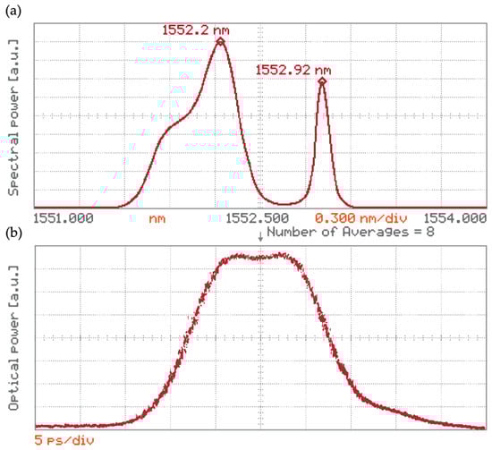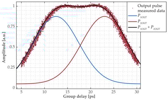 To better determine the relative time delay seen on the oscilloscope, we assumed the curve in Figure 6b to be the result of the superposition of two partially overlapping sech2 pulses, of which spectra are shown in Figure 6a and have wavelengths of λ = 1552.2 nm and λcm = 1552.92 nm, respectively. Such a scenario was simulated, and the results are shown in Figure 7. From here, the relative delay Δτ was estimated as Δτ = 10.5 ps.