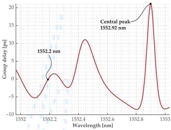 Calculated/modeled relative group delay as a function of wavelength generated by the grating at its transmission output. (For λ = 1552.2 nm and λcm = 1552.92 nm see Figure 6a).