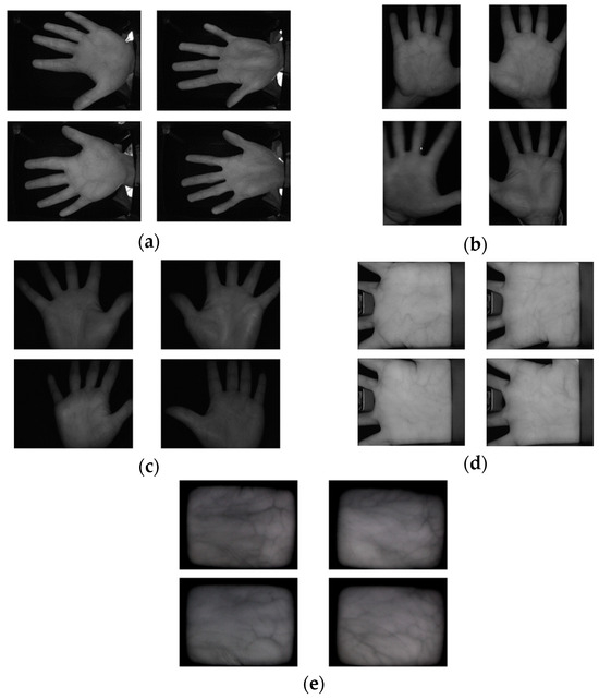 Examples from palm vein datasets: (a) CASIA, (b) Vera, (c) Tongji, (d) PolyU, and (e) PUT.