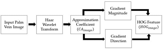 A wavelet feature is a texture feature that is extracted based on wavelet transformation. Wavelet transformation is applied to the palm vein image to obtain four component images. The components consist of approximation images (cA), a horizontal detail image (cH), a vertical detail image (cV), and a diagonal detail image (cD) [60]. If a palm vein image is symbolized as I, the wavelet transformation generates I = {cA, cH, cV, cD}. The extraction of wavelet features is shown in Figure 4. This approximation image is a result of two low-pass filter processes in wavelet transformation. By using the approximation image only, the classification accuracy result can be increased [61].