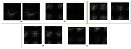 Combining a wavelet-transformed palm vein image with HOG features shows the essential information of a palm vein image. A block diagram of the hybrid wavelet and HOG feature extraction is shown in Figure 6. The input palm vein image is transformed by Haar wavelet to obtain an approximation coefficient. This approximated image is then calculated to acquire gradient magnitude and gradient direction. Based on these gradients, the HOG feature can be aligned. The procedure of the proposed hybrid wavelet and HOG feature extraction method is shown in Table 3. The results of the proposed method are provided as HOG features in Figure 7a–e for the CASIA, Vera, Tongji, PolyU, and PUT datasets, respectively.