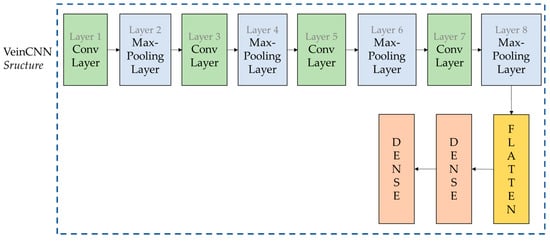 CNN is one of several deep learning methods used to recognize images. However, the arrangement of the CNN must be a consideration to obtain a satisfactory performance, which involves the amount of input data and the network structure. A lack of data will lead to overfitting. Furthermore, the layers in the CNN will also affect the performance. In general, the convolution layer is the first, while the fully connected layer is the last. Convolution layers support the CNN to extract the characteristic features and information of an image. The fully connected layer will decide the number of parameters processed at the end of the network. Restricting the network to a maximum number of parameters should be a consideration, since too many parameters will lead to issues related to an increase in computational resources and overfitting [65]. There are several ways to find an agreement between the amount of data and the number of parameters that should be considered in a CNN for palm vein images. The convolution and max-pooling layers must be set into an optimum configuration in palm vein recognition. Therefore, a CNN configuration is developed in this research to verify the palm vein image, called VeinCNN. The developed VeinCNN applies one input layer, four convolution layers, four max-pooling layers, one flattened layer, and two dense layers, as shown in Figure 8.