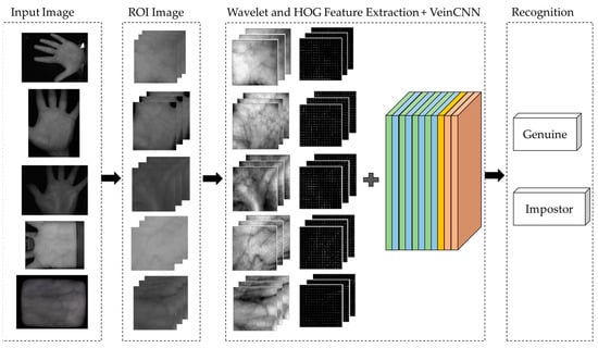 Block diagram of the proposed VeinCNN and wavelet feature extraction HOG combination palm vein recognition process.