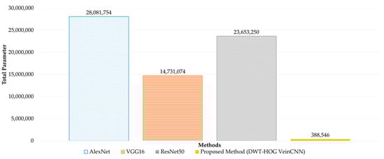 The application of the Hybrid DWT-HOG VeinCNN Method significantly impacts the total number of parameters in the CNN. The VeinCNN hybrid wavelet and HOG method requires 388,546 parameters. This number is much lower than in other transfer learning methods. It is 72 times lower than AlexNet, 38 times lower than VGG16, and 61 times lower than ResNet50.