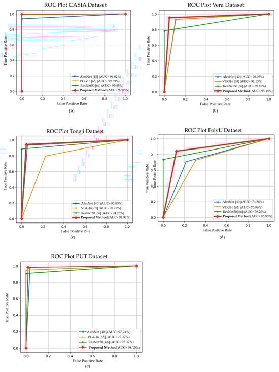 The AUC results of the transfer-learning-based methods on (a) CASIA, (b) Vera, (c) Tongji, (d) PolyU and (e) PUT dataset [40,65,66].