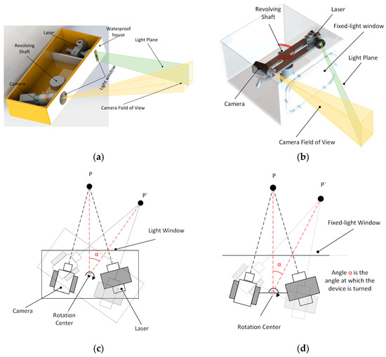 In the context of addressing the issue of refraction error in a system, as seen in Figure 1a,b, it is common practice in underwater 3D reconstruction to establish a fixed relationship between the light window, laser scanning imaging system, and rotary table. By maintaining a fixed configuration between these components, the system’s refraction error can be analyzed in a more stable manner [17]. As a result, this facilitates the creation of a static compensation algorithm that can be utilized to analyze the refraction process and mitigate the detrimental impacts of refraction on the laser scanning imaging system. The application of this technology facilitates improved observation of the refraction error phenomenon. Nevertheless, the analysis procedure is deficient in specificity and fails to comprehensively consider the mechanical parameters of the imaging system [18]. Furthermore, someone can expand upon the concept of stable refraction by undertaking an exhaustive examination of the two refraction processes through the utilization of three distinct media. In addition, mechanical parameters of the system are taken into account, such as the distance between the window plane and the optical center. This is performed to make the established refraction compensation model [19] more reliable and effective. However, it is worth noting that the calibration method for determining the distance between the optical center and the window plane often heavily relies on the aforementioned compensation model. The complexity of the problem-solving process is noteworthy. In addition to performing an analysis of the refraction process in order to mitigate the inaccuracy, a novel three-dimensional laser sensor was presented by Miguel Castillon et al. [20], wherein the inherent properties of a two-axis mirror were utilized to transform a projected curve into a straight line upon refraction in water. This strategy effectively mitigates the occurrence of refraction errors. In low-light situations underwater, the rotation of a conventional scanning device causes some degree of water fluctuation, which warps the light strip data that the system sensor receives about the object’s surface. To solve the problem, this research studies an underwater 3D scanning and imaging system that makes use of a fixed light window and a spinning laser (FWLS). The refraction compensation algorithm employed in the FWLS scanning imaging system, as investigated in this study, bears resemblance to the refraction compensation method utilized in the galvanometer–fixed light window imaging system [21]. However, it is worth noting that the refraction compensation algorithm in the latter system typically only takes into account the pixel coordinate shift in the return light. As seen in Figure 1b,d schematics, this study presents the development of a model that simulates the dynamic process of a FWLS scanning imaging system based on the imaging principle. The FWLS scanning imaging system’s refraction compensation technique is derived by solving the equations for the light plane and the dynamic pixel coordinate offsets related to dynamic refraction.