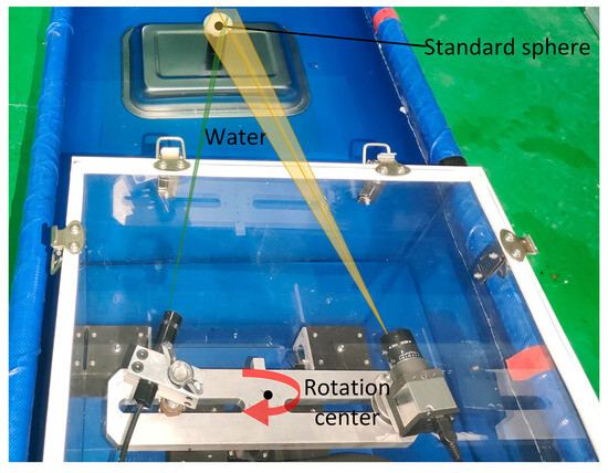 As seen in Figure 3, the camera and laser are affixed to opposite ends of the rotary table beam, with their relative locations remaining constant. The motor rotation axis is positioned at a vertical distance of 9 cm from the light window. By manipulating the motor rotation speed and direction at the controller end, the beam may be rotated. This allows for horizontal scanning of the system at a fixed point within a 360° range. The complete device is housed within a waterproof cover constructed from ultra-clear transparent glass, which has a transmittance rate of 90%, with dimensions of 30 cm × 30 cm × 40 cm and a wall thickness of 5 mm. The refractive index of water is 1.3333.