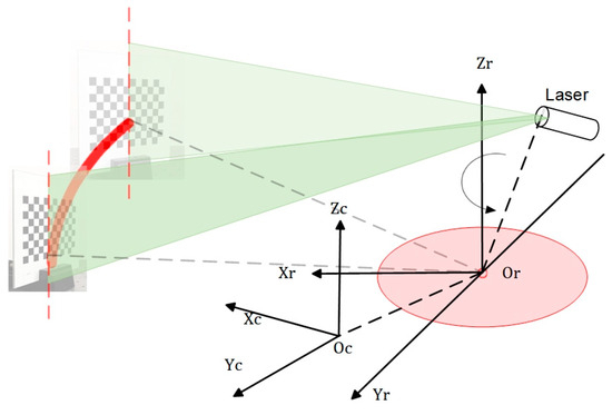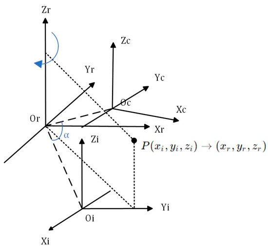 In the context of rotary scanning measurement, if the rotation angle is known (which is determined by the motor controller), it is possible to obtain the point cloud data of the entire object surface by performing a coordinate solution using the camera external reference matrix and the light plane equation, provided that the linear equation of the rotation axis is obtained. As depicted in the theoretical model of the imaging device illustrated in Figure 5, it is observed that the Zr axis aligns with the rotational axis of the system. The coordinate system for the rotation axis is denoted as .The camera coordinate system at the initial scanning location of the device is denoted as , while the CCD optical center is represented as Oc. After rotating clockwise by an angle of α around the rotation axis Zr, the camera coordinate system is denoted as .