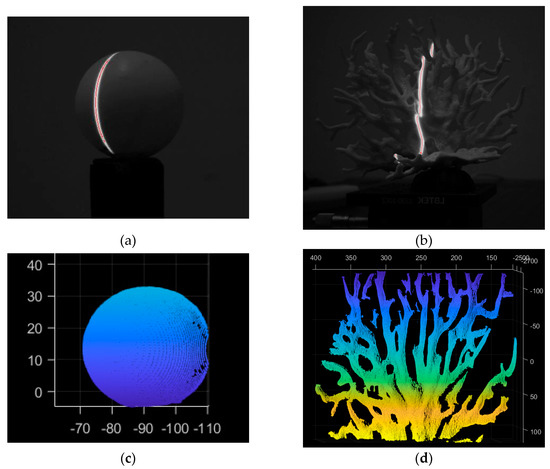 Diagram of the light bar center extraction effect. (a) Extraction effect of standard sphere stripe center; (b) Extraction effect of coral stripe center; (c) 3D point cloud model of a standard sphere; (d) 3D point cloud model of coral.